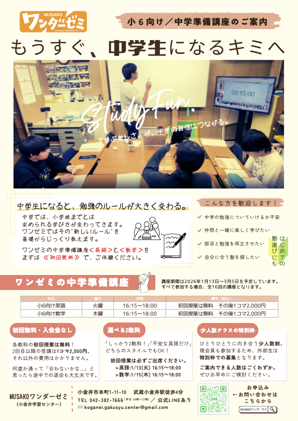 もうすぐ中学生になる君へ、「小6向け/中学準備講座」受講生募集中です!